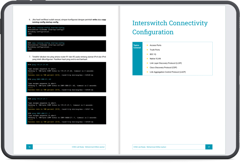 e-Book ini adalah Pegangan Wajib buat kamu yang sedang mempersiapkan diri menghadapi ujian sertifikasi CCNA, khususnya bagian Performance-Based Lab yang menuntut keterampilan konfigurasi jaringan secara langsung.