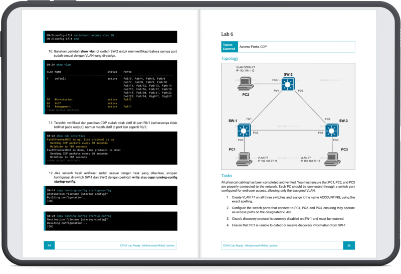 Buku CCNA Lab Ready berisi beragam skenario lab yang sering muncul dalam ujian CCNA yang sebenarnya. Setiap latihan yang diberikan mengacu pada exam objective resmi, sehingga membantu kamu fokus pada topik yang benar-benar relevan. Materi yang dibahas dalam e-book ini meliputi: