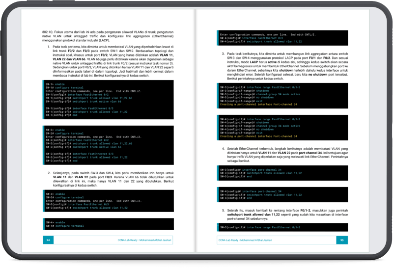 Fokus utama buku ini adalah latihan. Kamu diajak langsung mengerjakan soal-soal lab yang dirancang menyerupai soal asli ujian CCNA, tanpa harus membaca teori panjang lebar.
