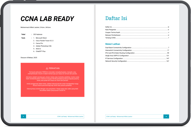 TIDAK. E-book ini hanya fokus pada pembahasan soal-soal Performance-Based Lab yang biasa muncul dalam ujian sertifikasi CCNA, khususnya yang dapat disimulasikan menggunakan Cisco Packet Tracer. E-book ini tidak membahas teori CCNA secara mendalam, troubleshooting tingkat lanjut berbasis CLI, atau simulasi yang membutuhkan perangkat nyata. Untuk topik-topik tersebut, disarankan merujuk ke sumber belajar lain yang lebih komprehensif.