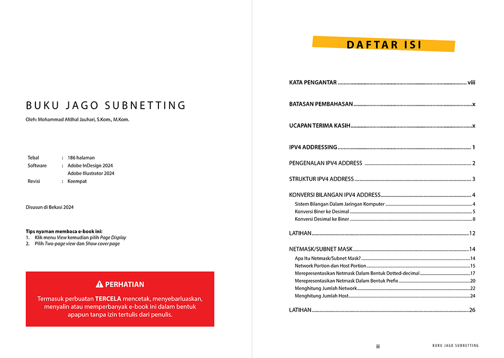 Buku Jago Subnetting ini disajikan secara bertahap mulai dari hal yang paling dasar menuju ke hal yang paling sulit bagi kebanyakan orang. Adapun materi yang dapat disajikan dalam e-book ini, antara lain: